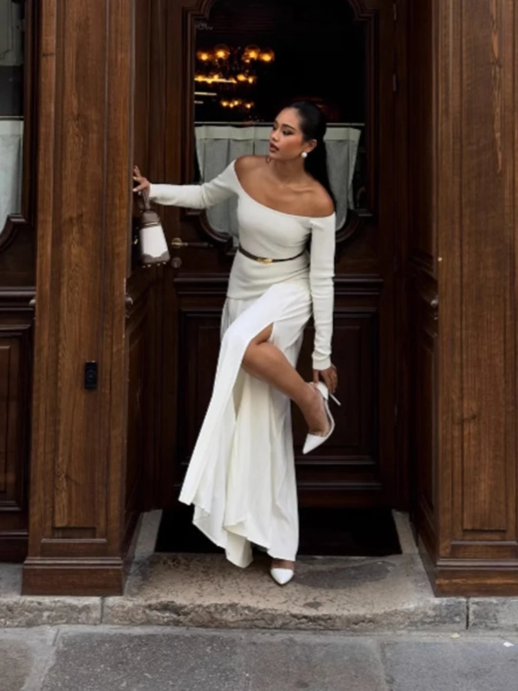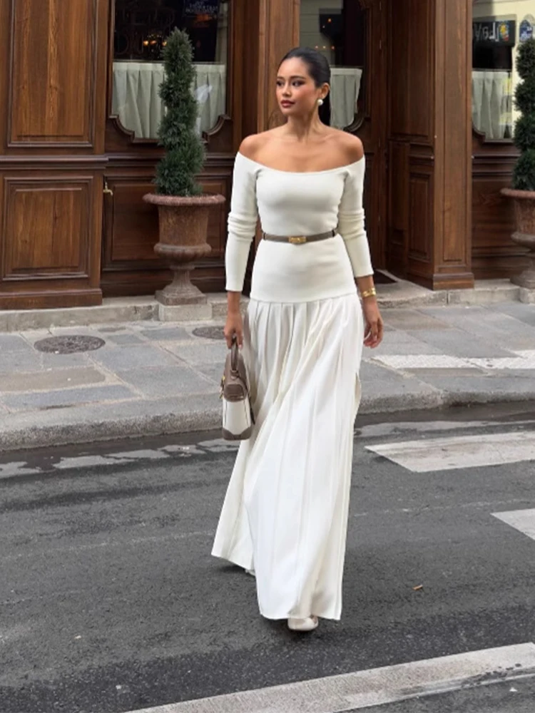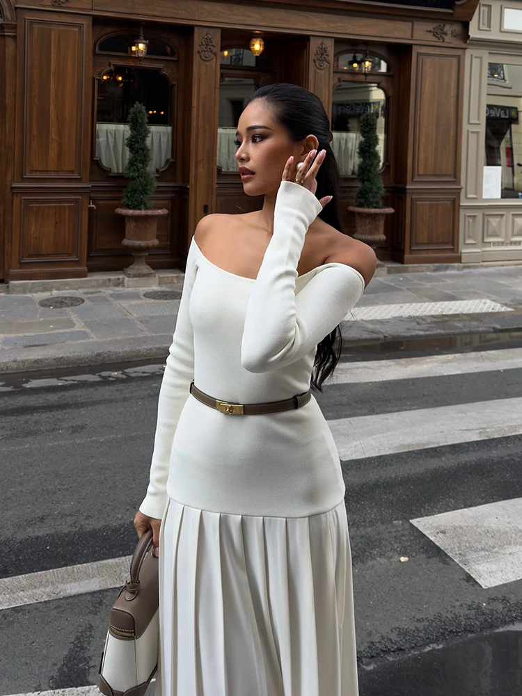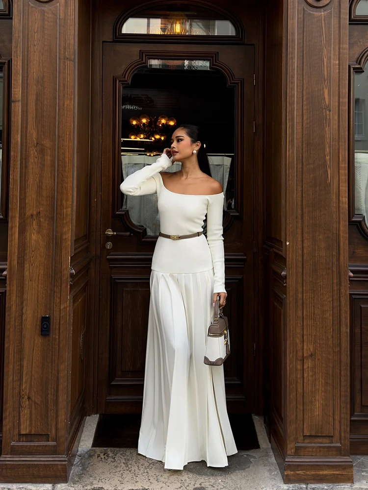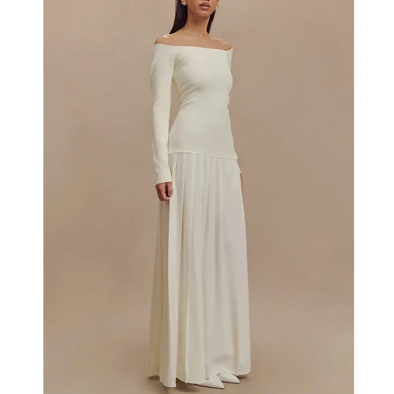 Elegant Off-shoulder Pleated Maxi Dress Long Sleeve Patchwork Long High Split Dresses